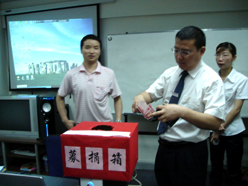 此時,我們必需團結(jié)起來,為了表達我們的愛心,我們采用了視頻與中山、江門的同事連線,讓我們大家共同為災(zāi)區(qū)的人禱告,共同來完成我們這個募捐活動。